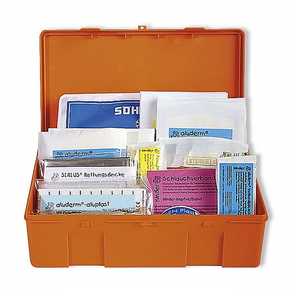 Kunststoffkasten, orange, 26 x 16 x 7 cm. Erste Hilfe-Füllung ist qualitativ gemäß DIN 13157/2021. Verbandspäckchen, Binden, Pflaster etc. sind jedoch in Abmessung und Ausführung den Bedürfnissen von Kindern angepasst.