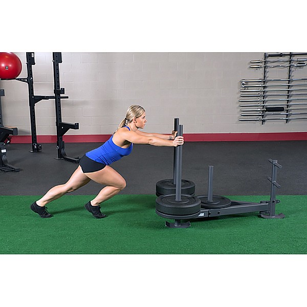 Ein Gewichtsschlitten bietet eine Vielzahl an Trainingsmöglichkeiten um Muskulatur und Kraftausdauer effizient zu trainieren. Dank der extrem robusten Stahlrahmenkonstruktion ist ein Training mit hohen Gewichten möglich. Vertikale und horizontale Handpfosten bieten auf beiden Seiten mehrere unterschiedliche Haltepositionen zum Schieben und Ziehen. Zusammen mit dem Mittelpfosten dienen die drei abnehmbaren vertikalen Pfosten gleichzeitig als Aufnahmen für das Trainingsgewicht. Mit mehreren Befestigungsankern ausgestattet kann an den Gewichtsschlitten fast jede Weste oder jeder Gürtel angebracht werden, was diesem Schlitten eine unübertroffene Vielseitigkeit verleiht. Für den professionellen Einsatz in Fitnessstudios geeignet.