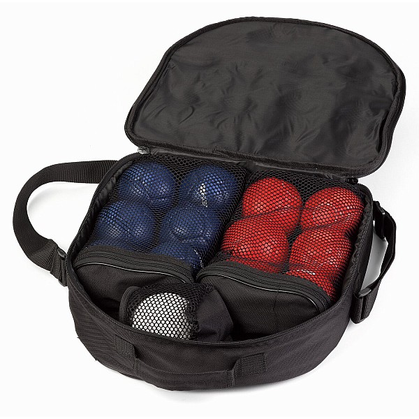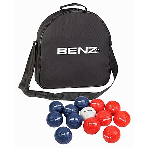 Das Benz Sport Boccia Indoor Set enthält 13 Kugeln und eine Transporttasche. Es besteht aus sechs roten, sechs blauen und einer weißen Zielkugel (Pallino“) mit verlangsamten Rolleigenschaften, gefertigt aus PU-Leder mit Kunststoffgranulat-Füllung. Die Kugeln sind für den Einsatz in Innenräumen konzipiert und bieten durch die Materialkombination eine kontrollierte, gedämpfte Rollbewegung.