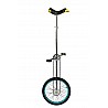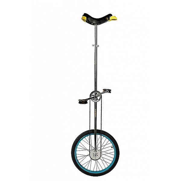 Hocheinrad mit Kettenantrieb und verchromten Stahlrahmen. Höhe 150 cm. Blau eloxierte 36 Loch Alufelge. Schwarze 20" x 1.95 Zoll Reifen. Gekapseltes Innenlager, blau eloxierte Disc Nabe aus Aluminium und schwarze Kunststoffpedale. Mindestschrittlänge 57 cm, Gewicht 6,65 kg.