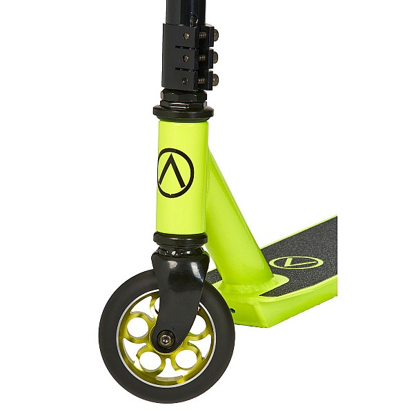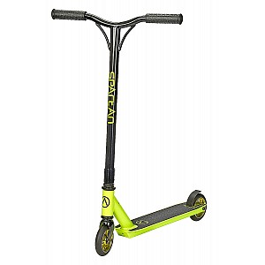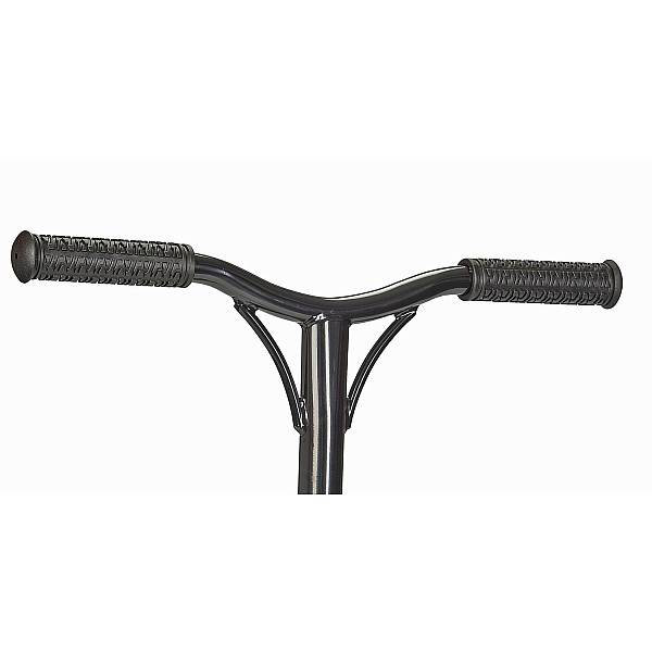 Die 100 x 24 mm spezial Stunt Scooter Rollen sorgen vor und nach dem Stunt für perfekten Bodenkontakt und Kontrolle. Die ABEC 7 Kugellager bieten geringen Rollwiederstand bei maximaler Stabilität. Verstärkte Achsen sorgen für eine sichere Landung auch nach Sprüngen und Tricks mit dem Stuntscooter. Der U-Lenker ist extra breit (44 cm) und ermöglicht auch einen Griff in der Mitte des Lenkers um bei Sprüngen und Stunts den Scooter unter Kontrolle zu halten. Die Griffe sind aus Gummi und bieten auch verschwitzten Händen den benötigten Halt.