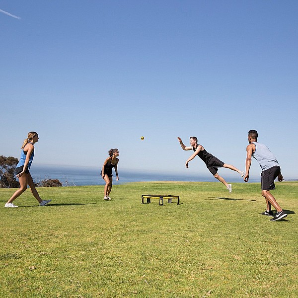 Das Spikeball Reaktionsspiel "Pro" bietet dank seiner widerstandsfähigen Rahmenkonstruktion eine hohe Stabilität und eignet sich daher ideal für intensives und häufiges Spiel. Die Rahmenteile sind aus bruchfestem Kunststoff hergestellt, was zu einer verwindungsfreien Konstruktion führt. Im Gegensatz zum klassischen Spikeball ist der Rahmen oval. Das Netz ist formstabil und reißfest und kann dank der soliden Haken an der Gestellunterkante befestigt werden. Die neuen Haken und das optimierte Gestell ermöglichen eine höhere Spannung auf dem Netz.
