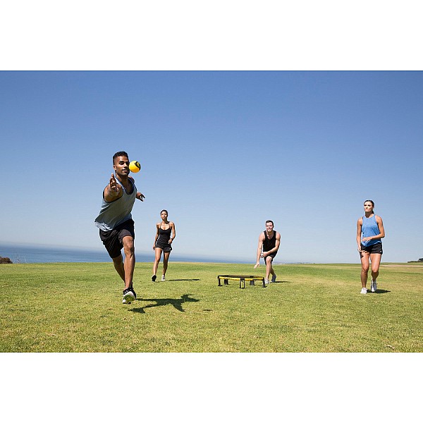 Das Spikeball Reaktionsspiel "Pro" bietet dank seiner widerstandsfähigen Rahmenkonstruktion eine hohe Stabilität und eignet sich daher ideal für intensives und häufiges Spiel. Die Rahmenteile sind aus bruchfestem Kunststoff hergestellt, was zu einer verwindungsfreien Konstruktion führt. Im Gegensatz zum klassischen Spikeball ist der Rahmen oval. Der Rahmen ist in einer auffälligen gelben Signalfarbe gehalten, um eine gute Sichtbarkeit zu gewährleisten. Das Netz ist formstabil und reißfest und kann dank der soliden Haken an der Gestellunterkante befestigt werden. Die neuen Haken und das optimierte Gestell ermöglichen eine höhere Spannung auf dem Netz.