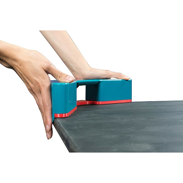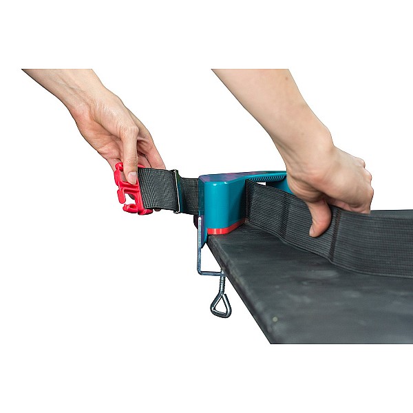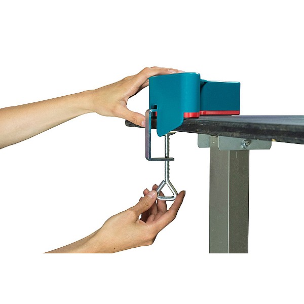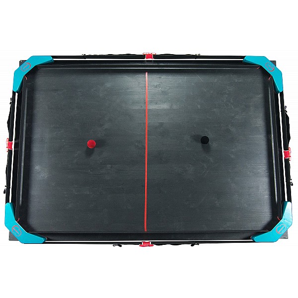 Das Spielfeld ist schnell und einfach aufgebaut. Mittels den mitgelieferten Klemmschrauben lassen sich die Tor-Eckteile am Tisch befestigen. Zwischen diesen Toren wird ein Gurt gespannt. Dieser sollte recht straff sitzen, so dass die 2 Spielbälle daran abprallen können.
