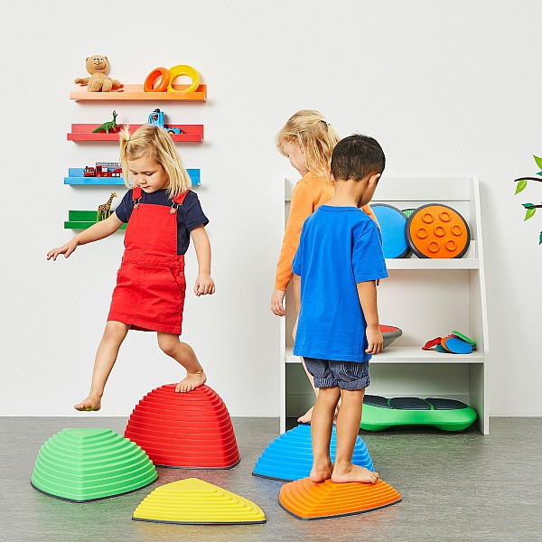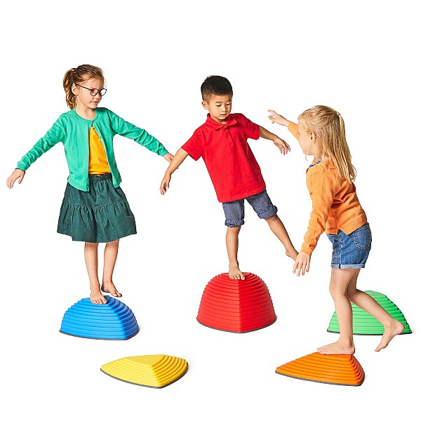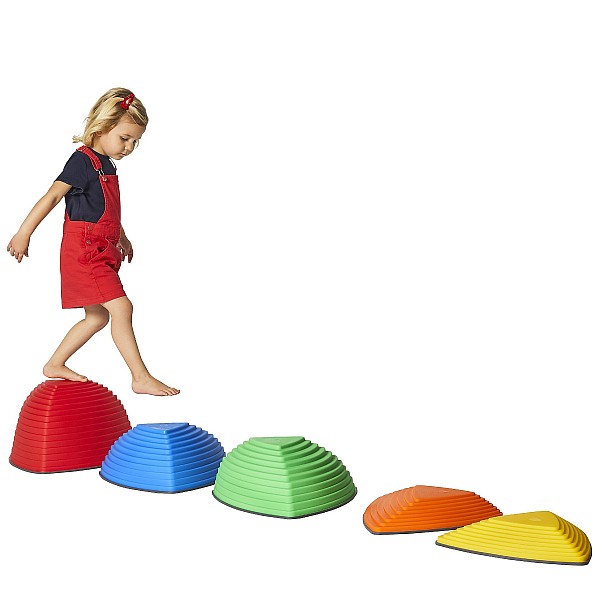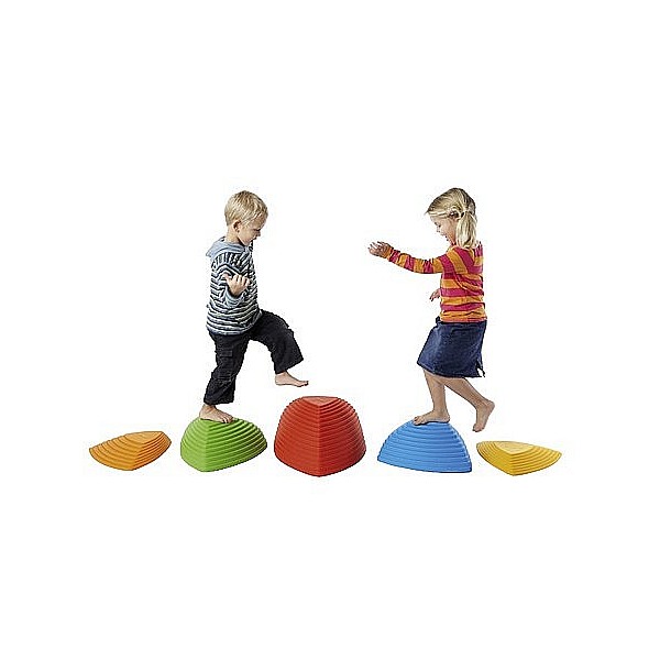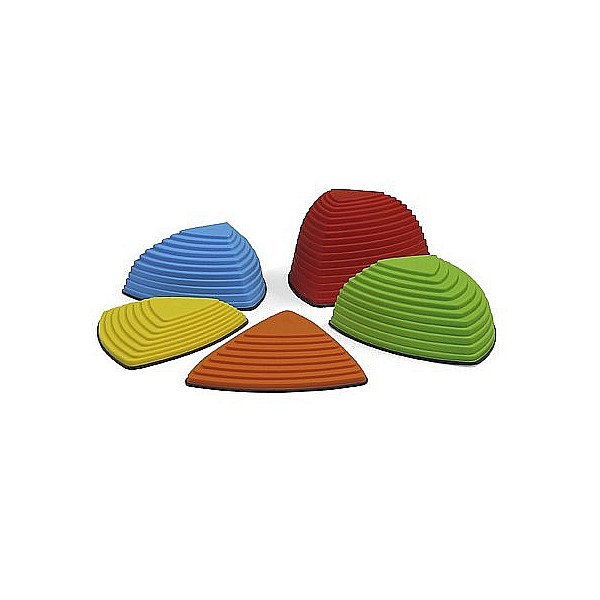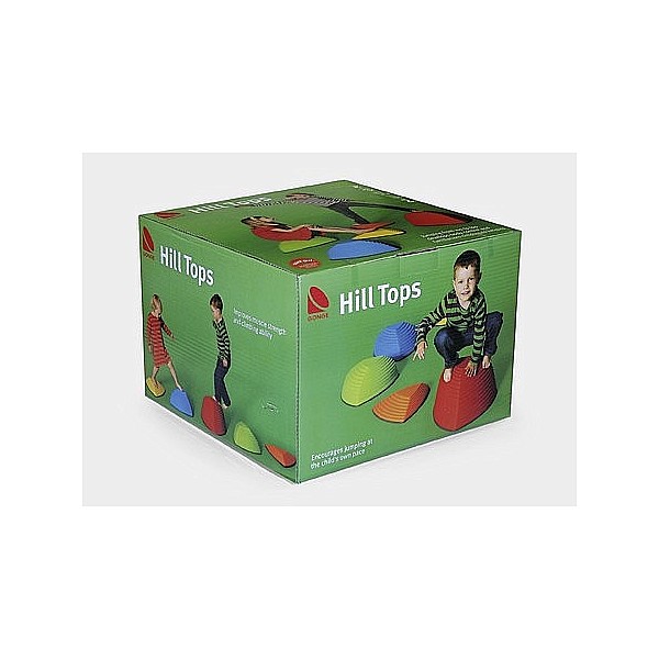 Set mit 5 unterschiedlich hohen, farbigen Hügelkuppen aus strapazierfähigem Kunststoff, mit rutschfester Gummikante die ein Wegrutschen verhindert und gleichzeitig den Boden vor Kratzern schützt. Die Kuppen sind so konstruiert, dass sie nicht Umstürzen können. Die unterschiedlichen Höhen der Hügelkuppen animieren die Kinder von Spitze zu Spitze zu springen, wobei sie die Fähigkeit erlernen Distanzen richtig einzuschätzen und sich gleichzeitig mit unterschiedlichen Höhen vertraut machen. Gleichgewichtssinn, Körperwahrnehmung, Koordination und Motorik werden spielerisch geschult. Zum Lagern praktisch stapelbar. Empfohlen für Kinder ab 2 Jahren. Gesamtgewicht ca. 4,80 kg. Maximalbelastung 100 kg.