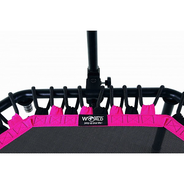 WORLD JUMPING Home Premium Trampolin aus Spezialstahl inklusive Haltestange, Nahtband in pink oder blau, Rahmen schwarz pulverbeschichtet. Höhe 34 cm, Ø 120 cm, Gewicht 13 kg, Belastbarkeit 120-130 kg. Dieses Trampolin wurde speziell für den Heimgebrauch entwickelt.
