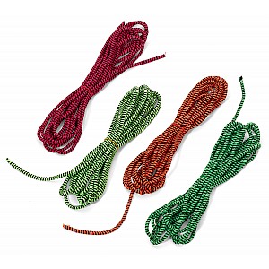Ein alter Spieleklassiker für eine Vielzahl von Hüpfspielen - solo, oder im Team. Dünnes Gummiseil ca. 5 m lang, Regenbogen-Farben.