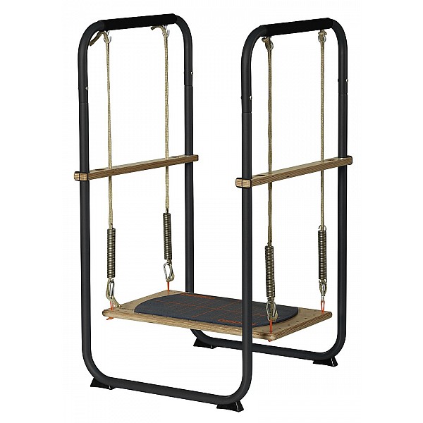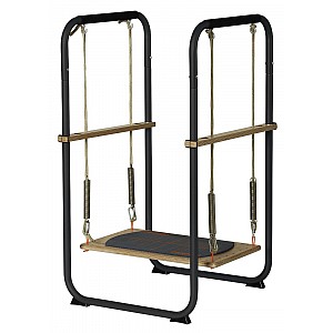 Durch die Ausstattung mit seitlich angebrachten, hüfthohen Bügeln kann sich der Trainierende beidseitig festhalten kann. Der Bewegungsausschlag ist dabei langsamer und weicher. Schnell zerlegbares, zusammengestecktes Metallgehäuse. Standplattform Birke Multiplex, 60 x 35 cm abgehängt an 4 Federn mit dreidimensionaler Wirkung. 2 Kettengliederaufhängseile 'kurz' für Training ohne Federn und 4 Kettengliederaufhängeseile 'lang' zum Abhängen der Standplattform in unterschiedlichen Höhen. 1 Paar Bewegungsbegrenzer, stufenlos höhenverstellbar.