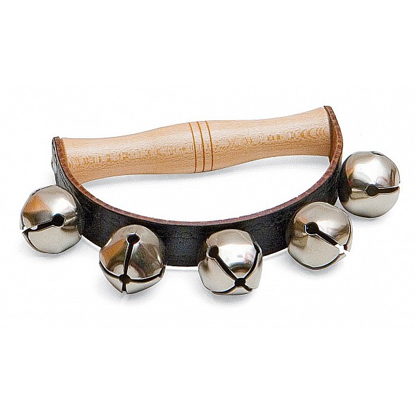 Glockenkranz (auch Schellenkranz genannt) mit Glöckchen und einem Griff aus Holz. Die Glöckchen sind fest mit einem stabilen Lederriemen verbunden, der an einem Holzgriff angebracht ist.