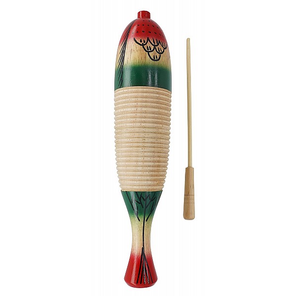Mexikanisches Guiro aus Holz mit Holz-Scraper. Beim Reiben mit dem Scraper aus Holz über die gerillte Oberfläche des Guiro entsteht der charakteristische, schnarrende Klang.