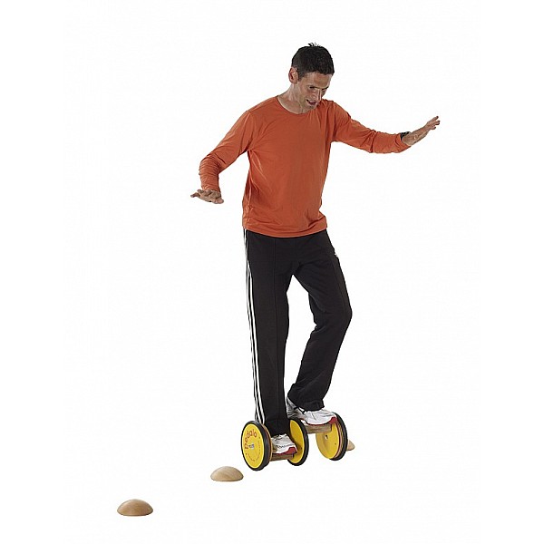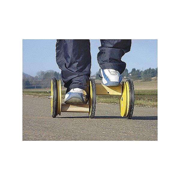 Das einzige Pedalo mit dem man Kurven fahren kann. Aus diesem Grund wird dieses Pedalo auch sehr gerne von Skifahrern als Trainingsgerät eingesetzt. 3 große mit schwarzem PVC bereifte Holzräder. Die beschichteten Trittflächen sind 6 x 14 cm groß.
