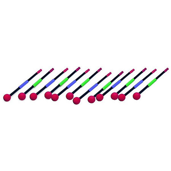 12 Paddel in 2 x 6 Farben, 89 cm lang, 3 NoBounce-Bälle Ø 6 cm. Jedes Paddel hat einen strapazierfähigen, gepolsterten Handgriff. Für Ballspiele wie Polo oder zum Bewegen der Rollbretter.