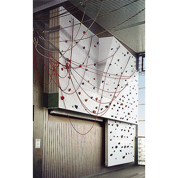 Kletterwände sind heute aus modernen Sporthallen nicht mehr wegzudenken. Die Nutzungsmöglichkeiten der Hallen werden vielseitiger und werden so den unterschiedlichsten Anforderungen der Sportler gerecht. Die normale Hallennutzung für Schul-und Vereinssport darf durch die Kletteranlagen nicht beeinträchtigt werden. Die Sicherheitsaspekte müssen voll erfüllt bleiben. Die Prallwände z.B. müssen auch in diesem Bereich durchgehend vorhanden sein. Des Weiteren muss die Kletteranlage vor unbeaufsichtigter Benutzung gesichert werden. Aus diesem Grund wurde eine Anlage konzipiert, die im Einstiegsbereich hochgezogen werden kann und damit diese Sicherheitsanforderungen erfüllt. Diese Anlage hat den großen Vorteil, dass der hochgefahrene Teil hinter dem fest montierten oberen Kletterwandelement verschwindet. Es sind somit im oberen festen Bereich alle Kletterwandversionen (senkrecht, Neigung, Überhänge) möglich, ohne dass dabei der hochziehbare Teil zu weit in die Halle hineinragt. Abmessungen (B x H) 2,50 m x 5,6 m. Überhang (B x H) 1,25 m x 2,75 m). Der untere Teil ist auf 2,5 m hochziehbar (lichtes Maß). Kletterfläche aus Schichtholzplatten (21 mm stark) mit Quarz-Velours-Oberfläche. Bohrungsraster 200 x 200 mm für die Klettergriffbefestigung. Seitliche Verkleidung aus lackiertem Schichtholz. Das in der Anlage enthaltene Befestigungsmaterial ist für die Montage auf Beton mit einer Mindestfestigkeit von B25 vorgesehen. Im Lieferumfang sind 1 elektrische Seilwinde mit eingebautem Endschalter, 1 Absturzsicherung nach DIN 7892 und 3 Topropesicherungen enthalten. Ohne Klettergriffe und ohne Montage.