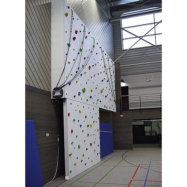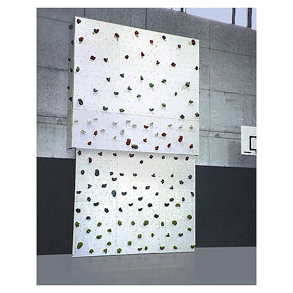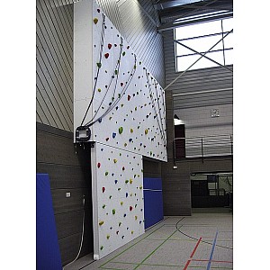 Kletterwände sind heute aus modernen Sporthallen nicht mehr wegzudenken. Die Nutzungsmöglichkeiten der Hallen werden vielseitiger und werden so den unterschiedlichsten Anforderungen der Sportler gerecht. Die normale Hallennutzung für Schul-und Vereinssport darf durch die Kletteranlagen nicht beeinträchtigt werden. Die Sicherheitsaspekte müssen voll erfüllt bleiben. Die Prallwände z.B. müssen auch in diesem Bereich durchgehend vorhanden sein. Des Weiteren muss die Kletteranlage vor unbeaufsichtigter Benutzung gesichert werden. Aus diesem Grund wurde eine Anlage konzipiert, die im Einstiegsbereich hochgezogen werden kann und damit diese Sicherheitsanforderungen erfüllt. Diese Anlage hat den großen Vorteil, dass der hochgefahrene Teil hinter dem fest montierten oberen Kletterwandelement verschwindet. Es sind somit im oberen festen Bereich alle Kletterwandversionen (senkrecht, Neigung, Überhänge) möglich, ohne dass dabei der hochziehbare Teil zu weit in die Halle hineinragt. Abmessungen (B x H) 2,50 m x 5,6 m. Der untere Teil ist auf 2,5 m hochziehbar (lichtes Maß). Kletterfläche aus Schichtholzplatten (21 mm stark) mit Quarz-Velours-Oberfläche. Bohrungsraster 200 x 200 mm für die Klettergriffbefestigung. Seitliche Verkleidung aus lackiertem Schichtholz. Das in der Anlage enthaltene Befestigungsmaterial ist für die Montage auf Beton mit einer Mindestfestigkeit von B25 vorgesehen. Im Lieferumfang sind 1 elektrische Seilwinde mit eingebautem Endschalter, 1 Absturzsicherung nach DIN 7892 und 3 Topropesicherungen enthalten. Ohne Klettergriffe und ohne Montage.