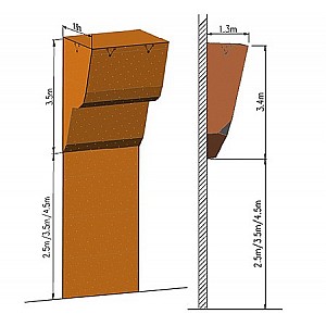 2-stufig verlaufender Überhang auf insgesamt 1,8 m Überhangtiefe. Schichtholz mit Sand-Harzoberfläche. Inklusive 2 Stück Einzel-Top-Rope-Sicherungen gemäß Produktblatt MTM-06 nach DIN EN 12 572. 2,5 x 7 m, 90 Klettergriffe.