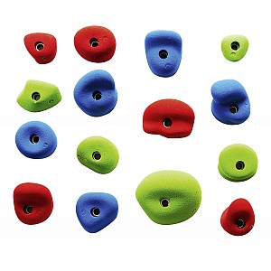 15 großformatige Schulklettergriffe und Tritte, bunt gemischt. Für den schulischen, pädagogischen und therapeutischen Einsatz. Diese Sets wurden speziell für die Anforderungen des Schulkletterbetriebes zusammengestellt und für den Einsatz an senkrechten, überhängenden und geneigten Kletter- und Boulderwänden entwickelt. Sie sind hervorragend für den Routenbau geeignet. 15 verschieden geformte Klettergriffe bilden dieses Set und werden gemischt in den Farben blau, gelb, grün, rot und schwarz geliefert. Die Klettergriffe unterscheiden sich in ihrer Größe, dadurch definiert sich auch der Schwierigkeitsgrad der Kletterrouten.