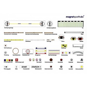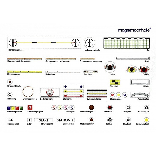 Die Magnetsporthalle unterstützt Übungsleiter bei der Planung und Durchführung von Sportunterricht und Training. Sämtliche Bestandteile einer Sporthalle sind detailgetreu auf Magnete gedruckt, so dass nahezu jede Sportart, jeder Geräteaufbau und jede Trainingssituation anschaulich visualisiert werden können.