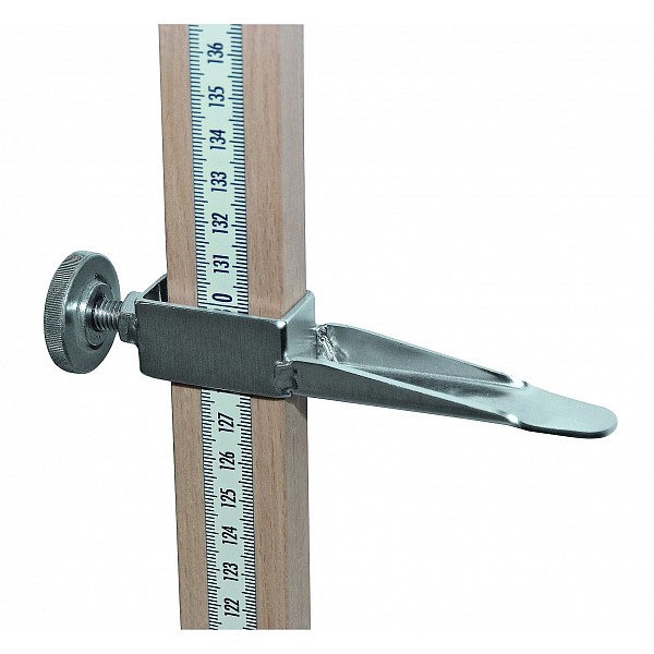 Holzleiste aus lackiertem Buchenholz mit aufgeklebtem Stahlmaßband und einem Edelstahlschieber mit Rändelmutter zur schnellen Messung der Höhe von Hochsprunglatten, Bändern oder Spielleinen und Netzen. Messbereich von 45 cm bis 253 cm.