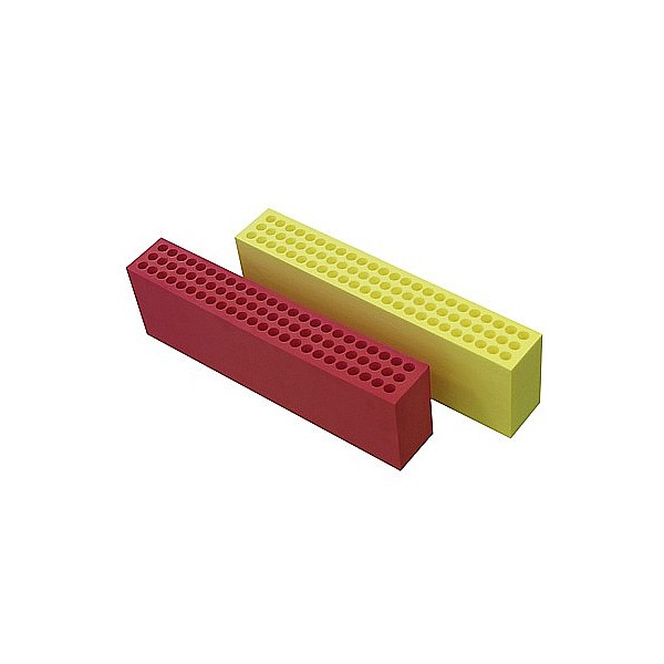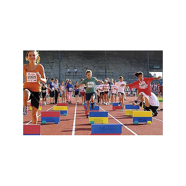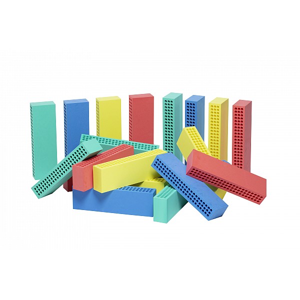 20 Schaumklötze je 50 x 15 x 9 cm in gelb, rot, blau und grün (je 5 Stück) aus hochwertigem PE-Schaumstoff mit Bohrungen. Dadurch geben Bausteine in Querrichtung leicht nach, während sie hochgestellt völlig stabil bleiben. Im Trainingsbereich unverzichtbar und vielseitig einsetzbar, z. B. zum Bau von Hürden, Hindernissen, Slalombahnen etc. Ohne Füße und Verbindungsstecker.