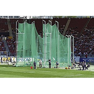 Nach neuer DLV-Regel 192 mit zwei zusätzlichen, schwenkbaren Flügeln (2 m breit). Für Gitterhöhe von 7 m auf 10 m im Flügelbereich ansteigend. Netzgröße von 7,5 m auf 10,5 m ansteigend, 31 m lang, Farbe grün. Maschenweite 50 mm, Netzkanten oben und seitlich und Randleine (Ø 8 mm) verstärkt, oben mit Schlaufen versehen. Nur in Verbindung mit Befestigungseinheit für hochziehbare Hammerwurf- und Diskus-Schutznetze.