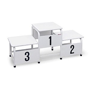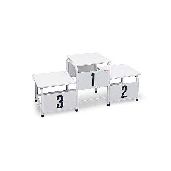 Stabile Stahlkonstruktion, Holzauftritte, beidseitige Blenden mit Zahlen 1-3, sämtliche Teile weiß lackiert.