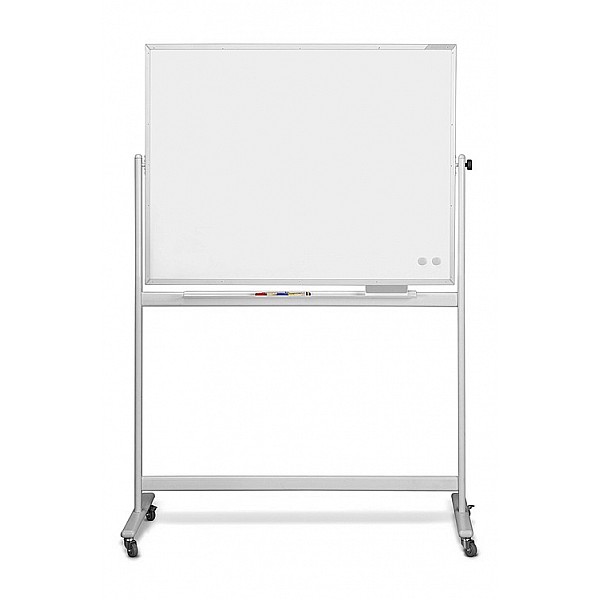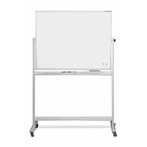 Mobile Gestelldrehtafel, 150 x 100 cm (B x H). Um 360° drehbar, mit Schraubknopf stufenlos arretierbar. Mit stabilem, umlaufenden Aluminium-Rahmen auf einem lichtgrauen Fahrgestell mit 4 leichtlaufenden Rollen, davon 2 feststellbar. Die lackierte, magnethaftende Oberfläche ist feucht und trocken abwischbar.