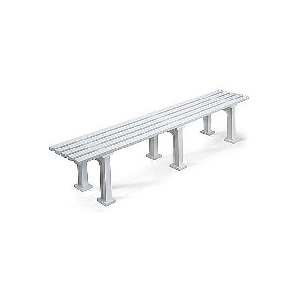 200 cm lang, weiß. 3 Vollkunststoff Füße sowie 5 Mehrkammerprofil-Latten, ohne Lehne - daher beidseitig verwendbar. Hoher Sitzkomfort, Gewicht ca. 9,9 kg.
