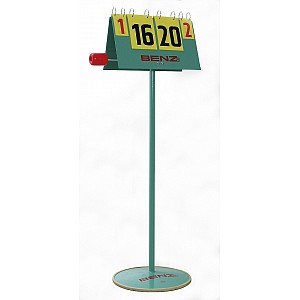Oberteil in Dachform auf Säule mit Tellerfußständer mit Gummirand, umlegbare Kunststoff-Nummerntafeln beidseitig nummeriert von 0-30, Satzanzeige 0-5, außerdem mit Vorrichtung für Aufschlaganzeige.