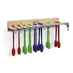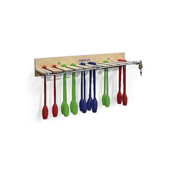Abschließbare Aufhängevorrichtung aus Holz für 20 Paar Gymnastikkeulen. Auch zur Lagerung von Badmintonschläger geeignet. Lieferung ohne Schloss.