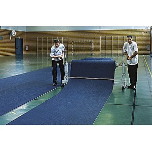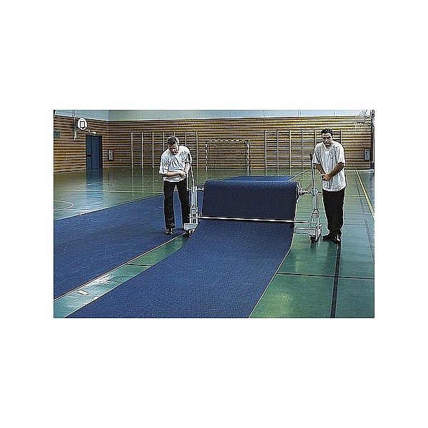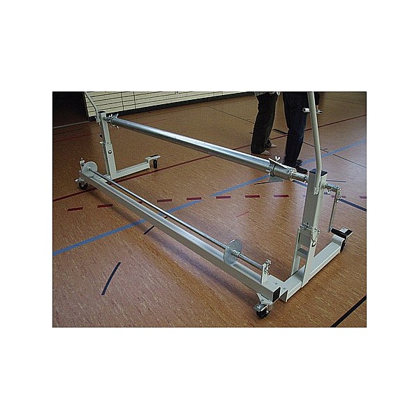 Von Sportboden und Sportboden-Schutzbelägen für 2 m Warenbreite. Der Belag wird manuell mittels 2 Handkurbeln aufgewickelt . Inkusive Rundrohr 76 mm, komplett. mit Führungsstange und 2 Rollenzentrierungen. Gesamtbreite: 2.78 m, Tiefe 1.03 m, Höhe 1.46 m.