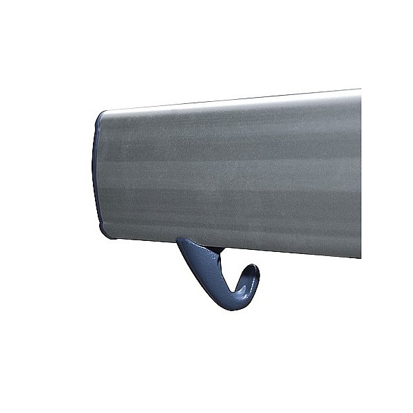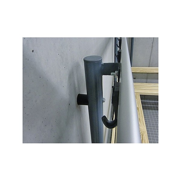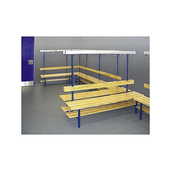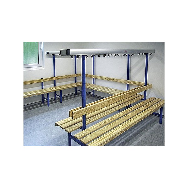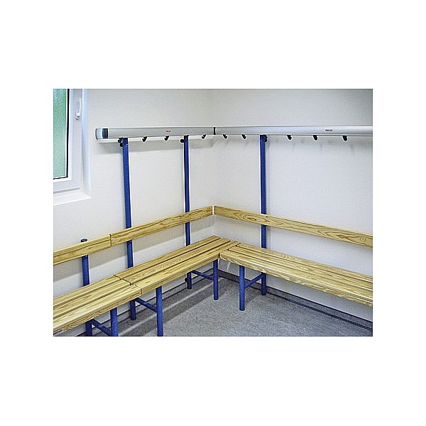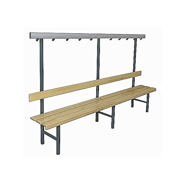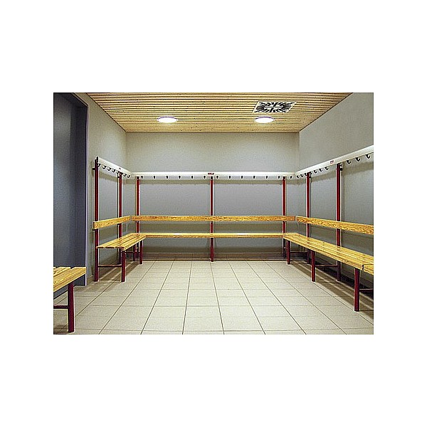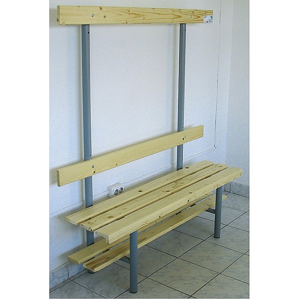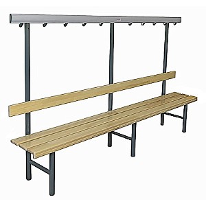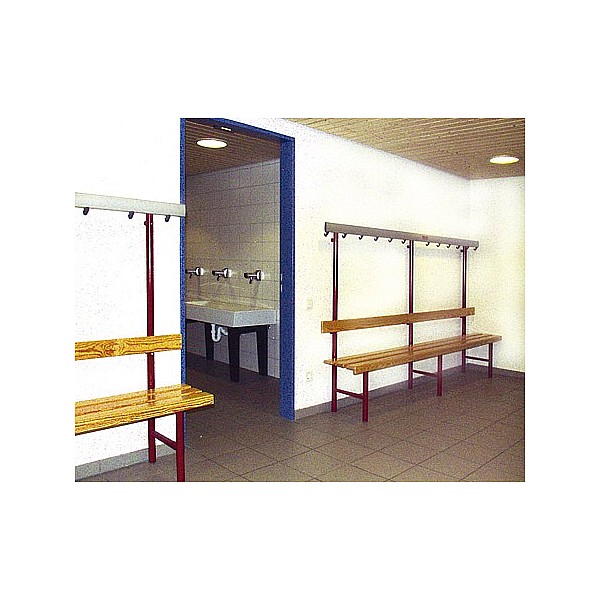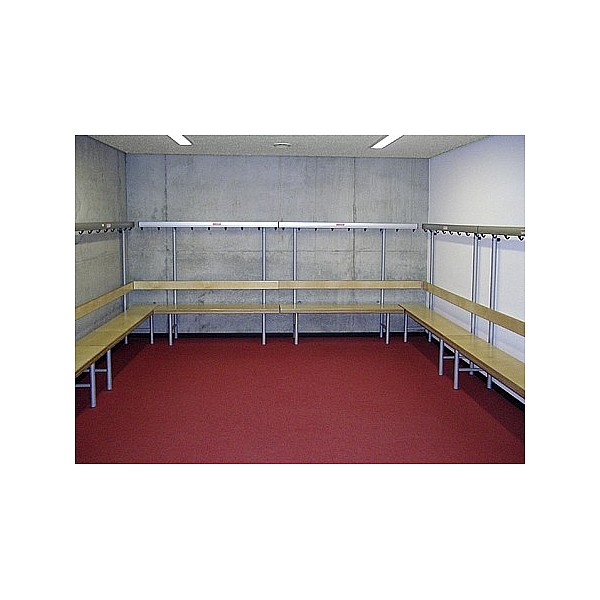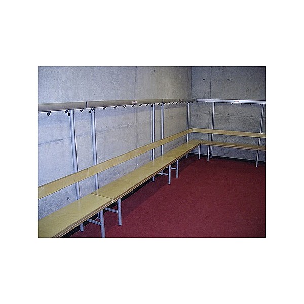 In bewährter Holz-Aluminium-Stahlkonstruktion. Die Standfüße werden aus Präzisions-Stahl-Rundrohr gefertigt und werden standardmäßig blaugrau nach RAL 7031 lackiert. Zur Bodenschonung sind die Füße mit PVC-Gleitern versehen. Die eloxierten Aluminiumprofil-Hakenleisten sind mit unzerbrechlichen Kunststoffhaken oder mit formschönen Edelstahl-Doppelhaken, ca. 5 Stück pro lfm bestückt. Die Haken sind entsprechend den Sicherheitsvorschriften des BUK angebracht. Sitz- und Rückenleisten sind aus Massivholz farblos lackiert. Die vordere Sitzleiste ist zusätzlich mit einer angebrachten Blendleiste ausgerüstet. Einseitig, zur Wandbefestigung, Sitzhöhe 45 cm, Breite 40 cm, Gesamthöhe 152 cm, jeweils 3 Sitzleisten und 1 Rückenleiste. Preis je cm