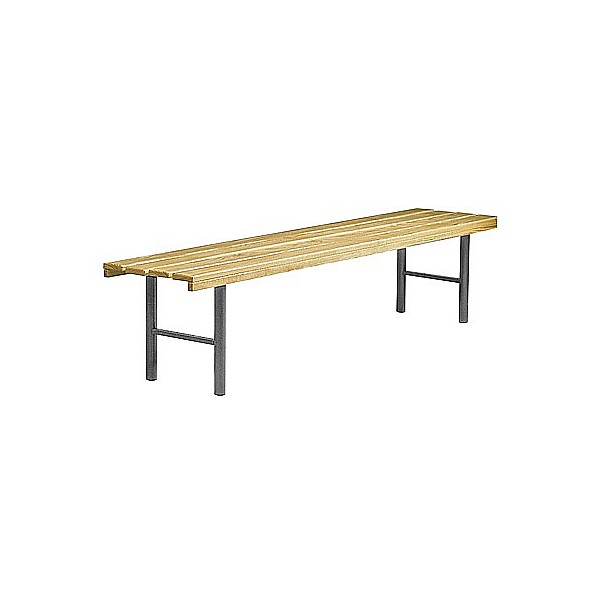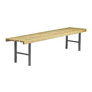 In bewährter Holz-Aluminium-Stahlkonstruktion. Die Standfüße werden aus Präzisions-Stahl-Rundrohr gefertigt und werden standardmäßig blaugrau nach RAL 7031 lackiert. Zur Bodenschonung sind die Füße mit PVC-Gleitern versehen. Sitzleisten sind aus Massivholz farblos lackiert. Die vordere Sitzleiste ist zusätzlich mit einer angebrachten Blendleiste ausgerüstet. (Übersteigbank), freistehend, ohne Rückenlehne, Sitzhöhe 45 cm, vier Sitzleisten, Gesamtbreite 43 cm. Ohne Schuhablage. Preis je cm