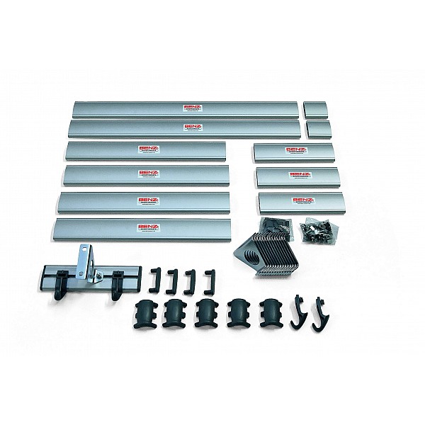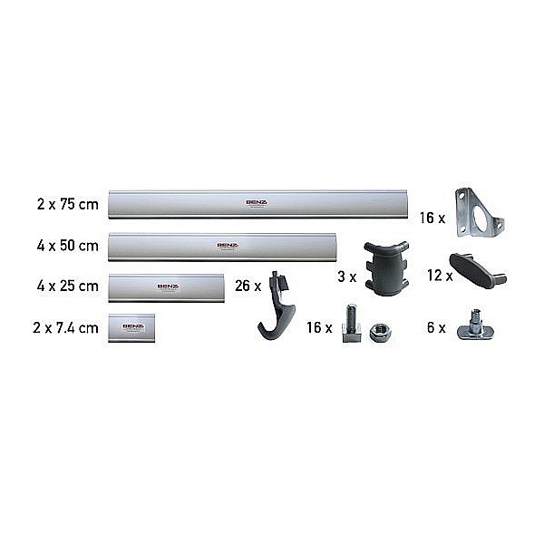 Das Garderobenleisten Set basiert auf dem seit vielen Jahren bewährten BENZ Garderobensystem, das durch seine strapazierfähigen Aluminiumleisten in Verbindung mit robusten Wandmontageelementen, Eckelementen, Endkappen und Kunstoffhaken überzeugt. Durch die Zusammenstellung des Garderobensets ist eine individuelle Anordnung der einzelnen Leisten ja nach Anforderung realisierbar. Durch die Verbindung der Aluminiumleisten mit den mitgelieferten Eckverbindungen sind auch 90 Grad - Lösungen realisierbar. Die Kunststoffhaken werden nur auf das Profil gesteckt und mit beiliegenden Kunststoffstiften gesichert. Die Wandhalterungen werden fest mit dem Profil verschraubt und müssen mit geeignetem Befestigungsmaterial (nicht im Lieferumfang) an der Wand befestigt werden. Das Set besteht aus folgenden Aluminiumleisten: 2 x 75 cm, 4 x 50 cm, 4 x 25 cm, 2 x 7,4 cm. 26 Garderobenhaken, 16 Wandhalter, 3 Eckverbinder, 12 Endkappen, Montagematerial für die Wandhalterungen an den Aluminiumprofilen und für die Garderobenhaken.