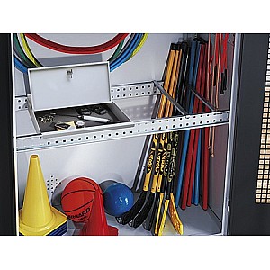 Wertfach abschließbar zu Modul-Sportgeräteschrank 5580, positioniert auf Längstraversen, vertikal und horizontal individuell verstellbar.