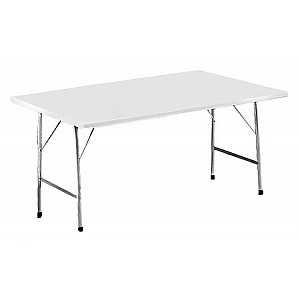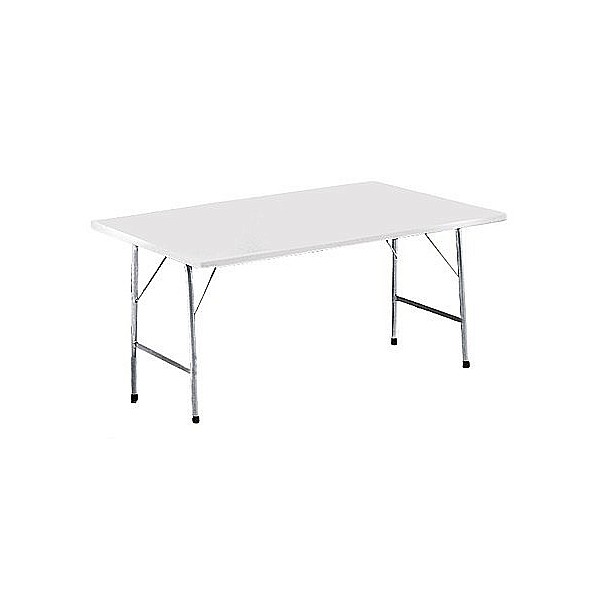 Wetterfeste, weiße Kunststoff-Tischplatte. Galvanisch verzinkter, einklappbarer Stahlrohr-Unterbau. Fußenden mit Kunststoffkappen. Abmessung 120 x 65 x 56 cm.