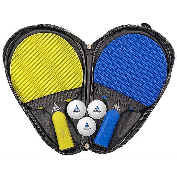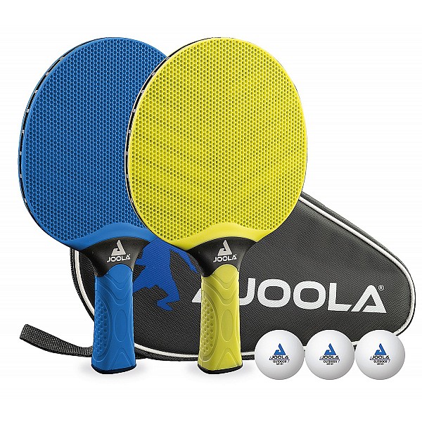 Das JOOLA Tischtennis-Set VIVID Outdoor mit zwei robusten und wetterfesten Schlägern im modernen Design! Der gummierte Griff des Outdoor Schlägers VIVID liegt sehr angenehm in der Hand und gibt dem Spieler jederzeit ein sicheres Gefühl. Die beigefügten, extra schweren Outdoor-Bälle behalten auch bei schwierigen Windbedingungen eine kontrollierte Flugbahn und erhöhen dadurch den Spielspaß. Dank der speziellen Oberflächenstruktur ist der Schläger besonders langlebig und auch nach häufigem Einsatz problemlos in der Lage Rotation zu erzeugen. Mit der Schlägerhülle JOOLA Pocket Double lässt sich das Set jederzeit komfortabel transportieren und verstauen. Entscheiden sie sich für einen der beiden farblich getrennten Schläger und fordern Sie Ihren Gegenüber zu einem Duell im Freien heraus!