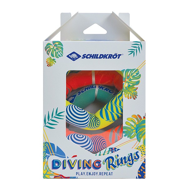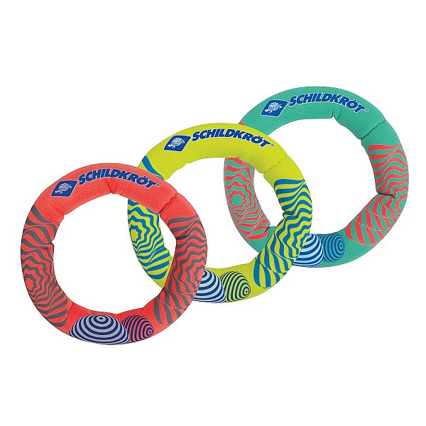 Die Besonderheit des 3er Tauchringsets von Schildkröt ist, dass die Ringe – im Gegensatz zu herkömmlichen Tauchringen – am Grund aufrecht unter Wasser stehen. Dank dieser Eigenschaft können Kinder die Neoprentauchringe leichter ertauchen. Die Ringe sind zu ¾ mit Sand gefüllt und ein zusätzlicher Schaumstoffeinsatz sorgt dafür, dass die Ringe aufrecht im Wasser stehen. Kinder haben dadurch ein schnelles Tauch-Erfolgserlebnis und einen Riesen-Spaß. Die leuchtenden Farben ermöglichen es, die Ringe gut im Wasser zu sehen. Durch das weiche Neoprenmaterial tut es nicht weh, wenn der Ring mal auf die Füße fällt - bei Hartplastik-Tauchringen ist das anders! Das Set ist auch ein ideales Geschenk zum Kindergeburtstag! Ein toller Spiel- und Tauchspaß im Wasser!