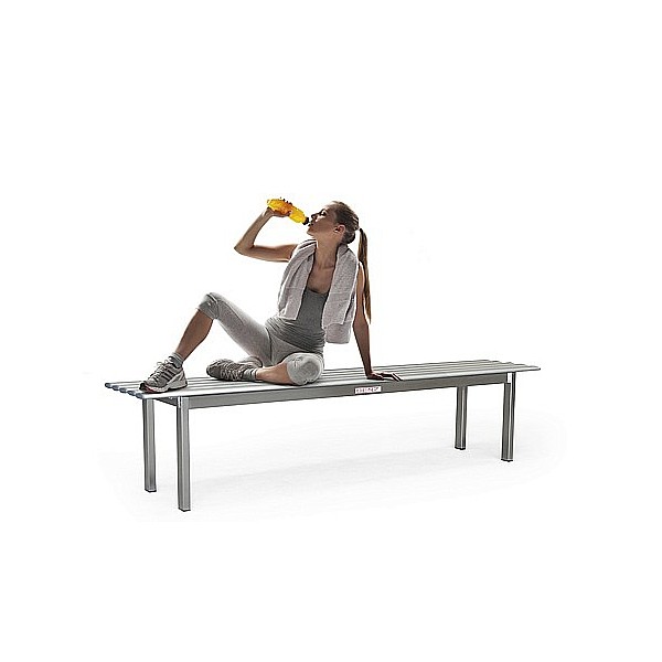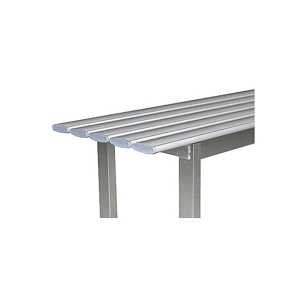 Sitzfläche aus 5 eloxierten ovalförmigen Aluprofilen, freistehend. Untergestell aus geschliffenem Edelstahlrohr. Sitzhöhe: 45 cm, Breite: 41 cm, Länge: 200 cm.