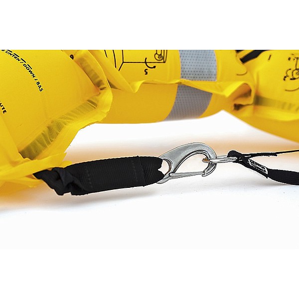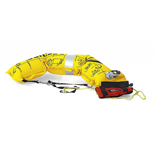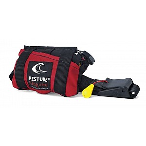 Auch der lifeguard ist in einer kleinen Tasche (16 x 10 x 7 cm) verpackt und wird um die Hüfte getragen. Zieht man den Auslöser, bläst sich die Boje innerhalb weniger Sekunden auf. Die Boje verfügt über 2 Knickstellen, sodass die Boje um den Körper des Verunfallten gelegt und mittels 4 Ösen durch Karabiner befestigt werden kann. Besonders hilfreich ist die Quickrelease-Schnalle. Sollte der Retter bei der Fremdrettung selbst in eine gefährliche Situation kommen, hat er die Möglichkeit sich schnell und komplett vom RESTUBE Lifeguard zu lösen. Besonders praktisch sind die Reflektorstreifen, die bei Dunkelheit mehr Sichtbarkeit verschaffen.