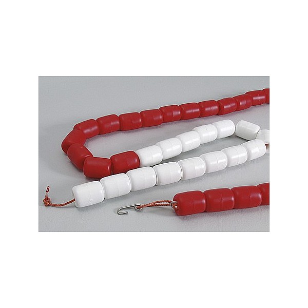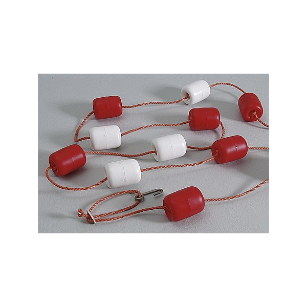 Polypropylenseil (Ø 6 mm) mit roten und weißen Hostalenkugeln, konfektioniert. Mit zwei Einhängehaken aus Edelstahl und Verstelleinrichtung für exakte Längeneinstellung.