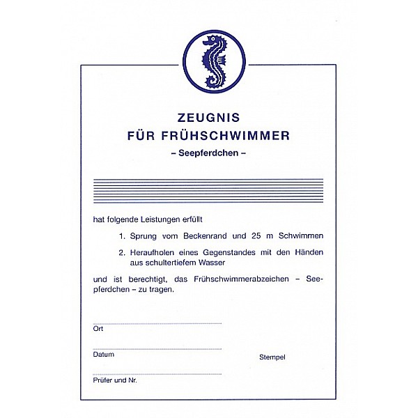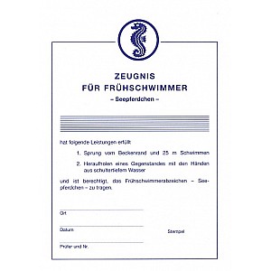 Urkunde für die erbrachte Leistung des Seepferdchen" Schwimmabzeichen."