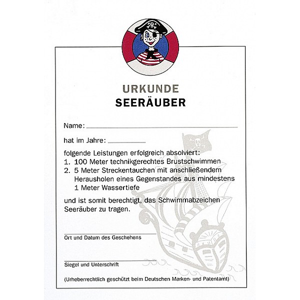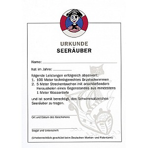 Urkunde für die erbrachte Leistung des Seeräuber" Schwimmabzeichen"