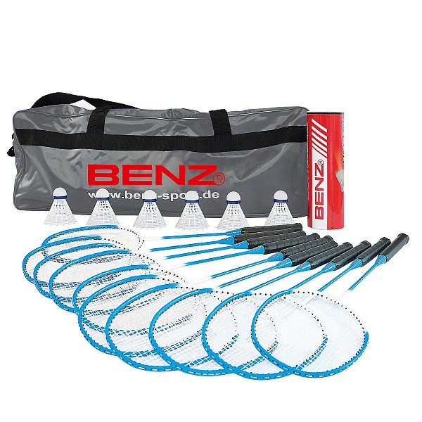10 x Badminton-Schläger Benz Beginner. 6er-Dose Nylonfederbälle. Badmintontasche für 10 Schläger