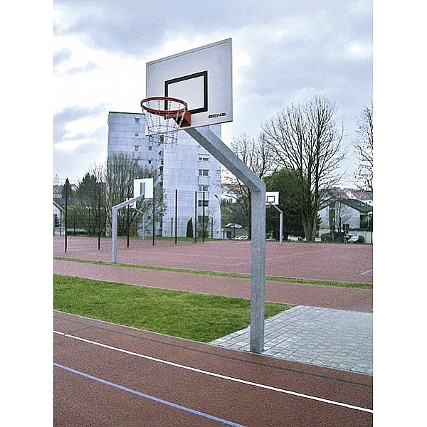Sehr stabile, feuerverzinkte Outdoor-Anlage aus starkwandigem Vierkant-Stahlrohr, 150 x 150 mm, Ausladung 165 cm. Inkl. Alu-Zielbrett, 90 x 120 cm, starrem Basketballkorb lackiert und Sicherheits-Kettennetz.