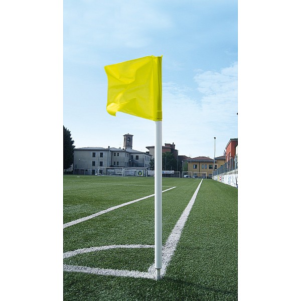 Set mit 4 "Professional"-Fußballeckstangen mit Gelenk Ø 50 mm + 4 gelbe Fahnen 60 x 40 cm + 4 Clips + 4 Hülsen mit Kappe Ø 30 mm. Erhältlich in den Stangenfarben gelb, weiß und gelb fluoreszierend Lieferung beinhaltet: