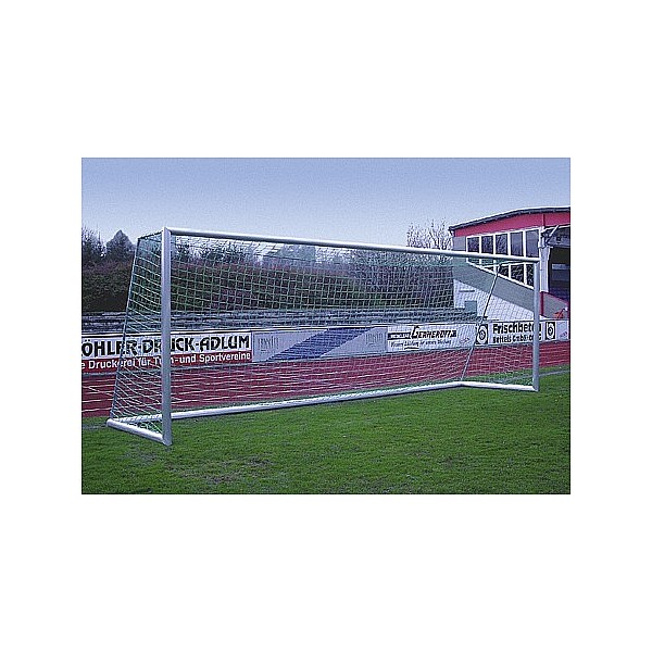 nur wenige mm über Profilradius sichtbar (verletzungsneutral). Netzhaltekonstruktion aus großen, äußerst robusten, feuerverzinkten Stahlnetzbügeln, dadurch speziell in den Eckbereichen zusätzliche sehr hohe Stabilität. Pfosten und Holme fest miteinander verschweißt. Inkl. Antikipp-Bodenverankerung (spiralförmige Erdanker und Haltebügel) für Weichbodenplätze.