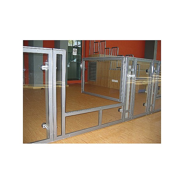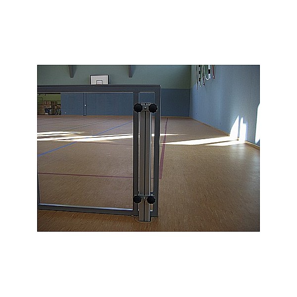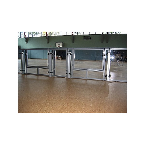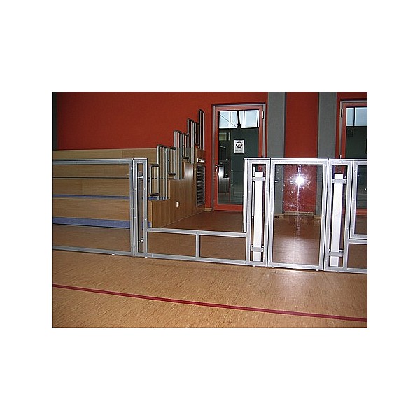 BENZ Fußball Bandenelement aus Stahlrohrrahmen, 2488 x 990 mm, farbig, nach RAL lackiert. Mit beidseitig weiß beschichteter Frontplatte aus MDF oder transparenten Polycarbonatplatten. Beide Ausführungen mit weißer Handlaufleiste.