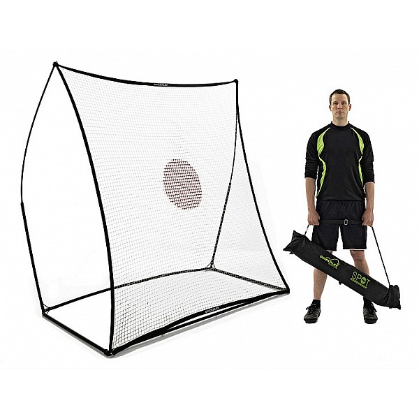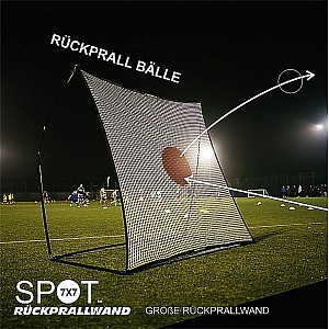 Die Spot-Rückprallwand mit den Abmessungen 2,13 x 2,13 m kann als Trainingsgerät für verschiedene Ballsportarten, wie z.B. Fußball, Handball oder Tennis eingesetzt werden. Wird der Ball auf das Netz geworfen oder geschossen, prallt er je nach Geschwindigkeit und Winkel unterschiedlich stark zurück. Es lassen sich so Ball-Annahmen, Pass-Spiel, Volleyschuss und viele andere Techniken optimal trainieren. Ein Steck-Mechanismus macht den Aufbau leicht und innerhalb von 2 Minuten steht die Spot Rückprallwand einsatzbereit auf dem Spielfeld. Die strapazierfähigen Stäbe sind mit elastischen Bändern miteinander verbunden und lassen sich einfach zusammenstecken. Mit Bodenankern wird das Trainings-Gerät fest im Boden verankert, so dass auch starke Schüsse möglich sind. Auseinandergebaut lässt sich die Wand mit der enthaltenen Tragetasche gut transportieren und durch die kompakten Maße leicht verstauen.