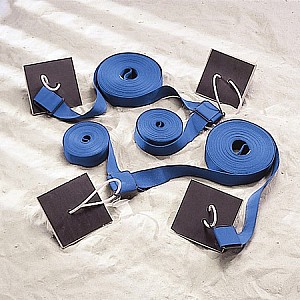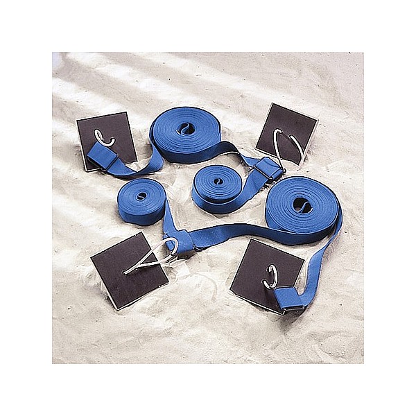 Profi-Ausführung, 9 x 18 m. Mit verstellbaren, glasfaserverstärkten Kunststoff-Eckelementen (verstellbar auf 8 x 16 m), 50 mm breitem Gurtband und Kennzeichnung in der Mitte. Komplett mit 4 Sandankerplatten und dunkelblauen Bungee-Spannleinen.