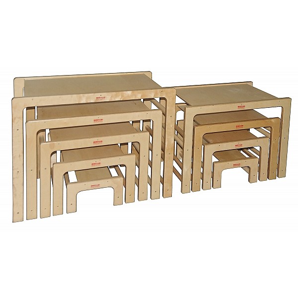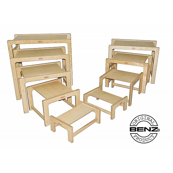 Sehr stabile, hochwertige Holzausführung, natur lackiert, bestehend aus 9 Holztreppen mit eingeleimter Deck-Trittplatte. Die sich dadurch ergebende geschlossene Fläche ermöglicht ein Spielen und Turnen ohne Unfallgefahr. Abmessungen größtes Element (B x H x T) 99 cm x 80 cm x 50 cm. Vermittelt spielerisch das Gefühl von Höhen und Distanzen. Ideal, um Kinder zum Balancieren zu animieren und für Bewegung zu begeistern. Ideal für Kindergarten, Vorschule und Grundschule.